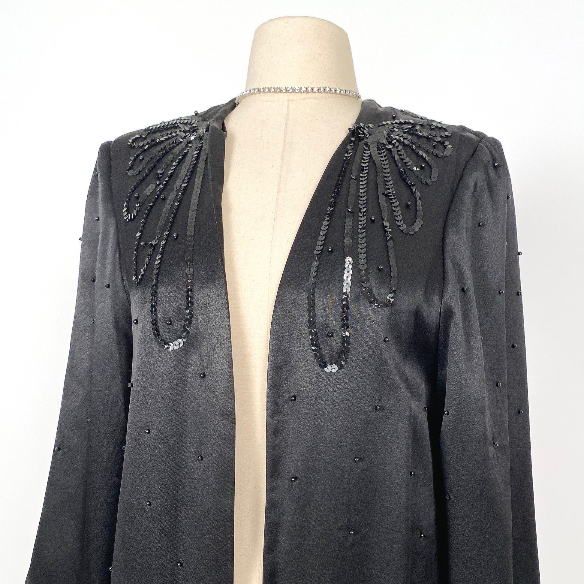 1960s black satin evening coat with black sequins and beads by Lilli Diamond. The shoulders are accented by pads and draped in sequins that flow down around the neckline in the back. The front, back, and sleeves are dotted by black beads -- Perfect for any occasion can be dressed up or down. No closure meant to be worn open.