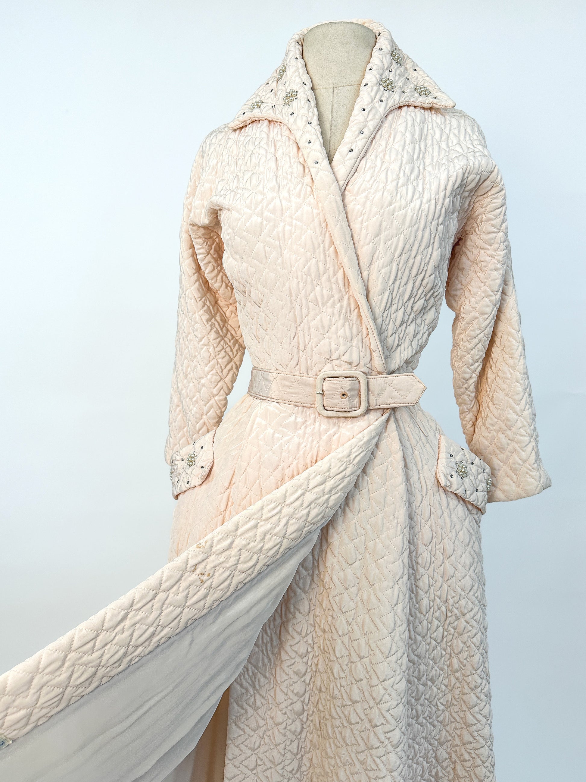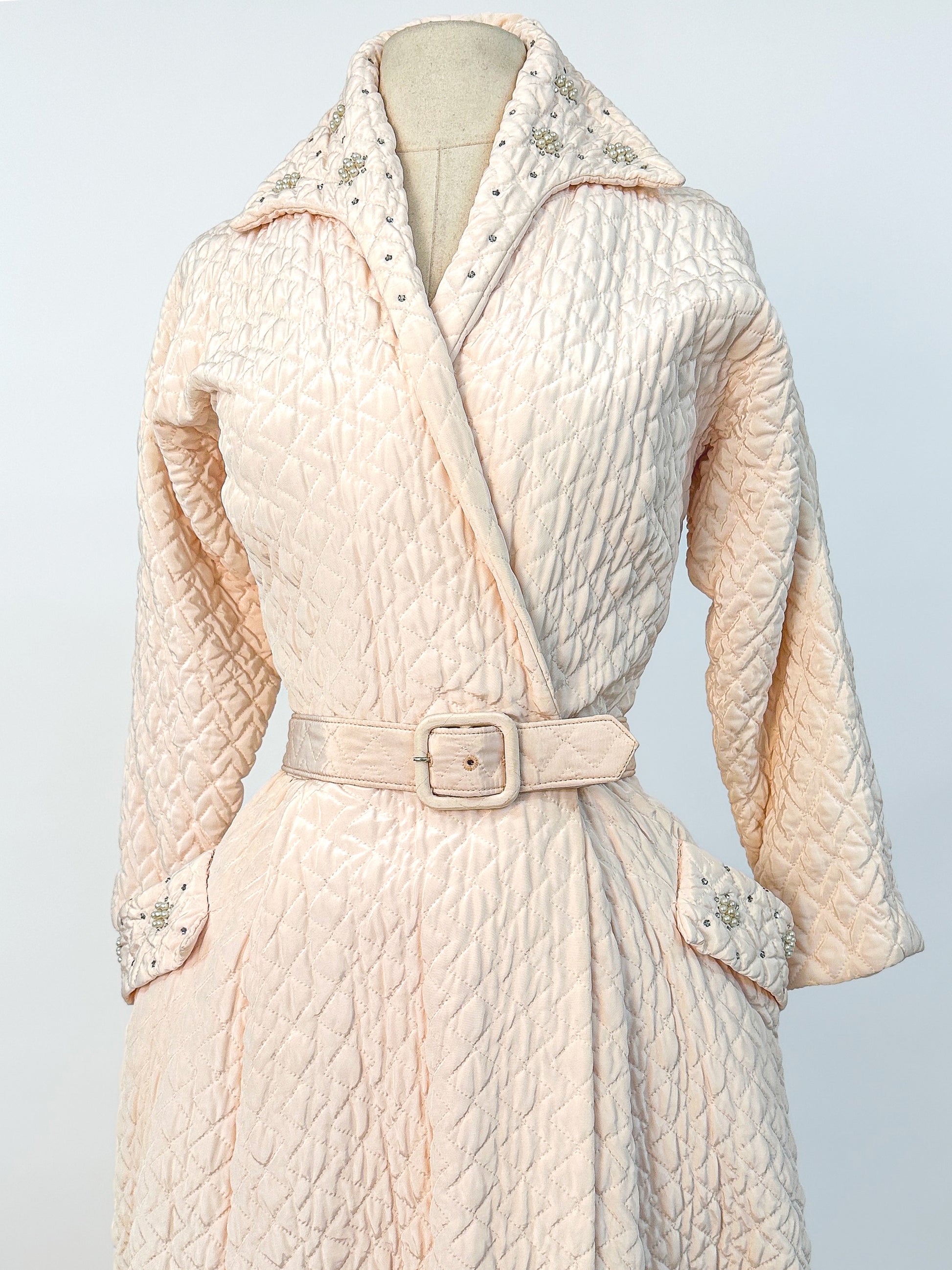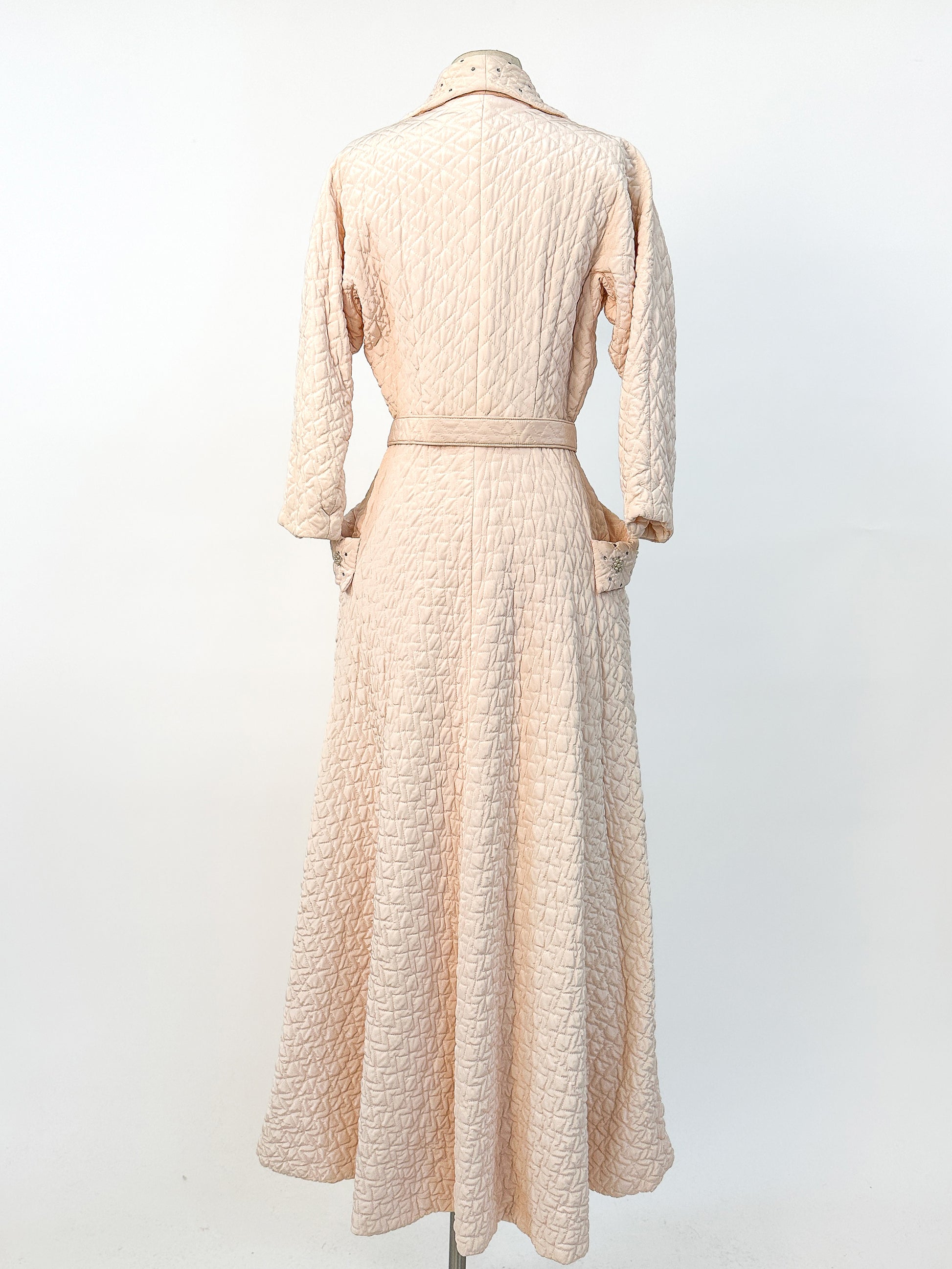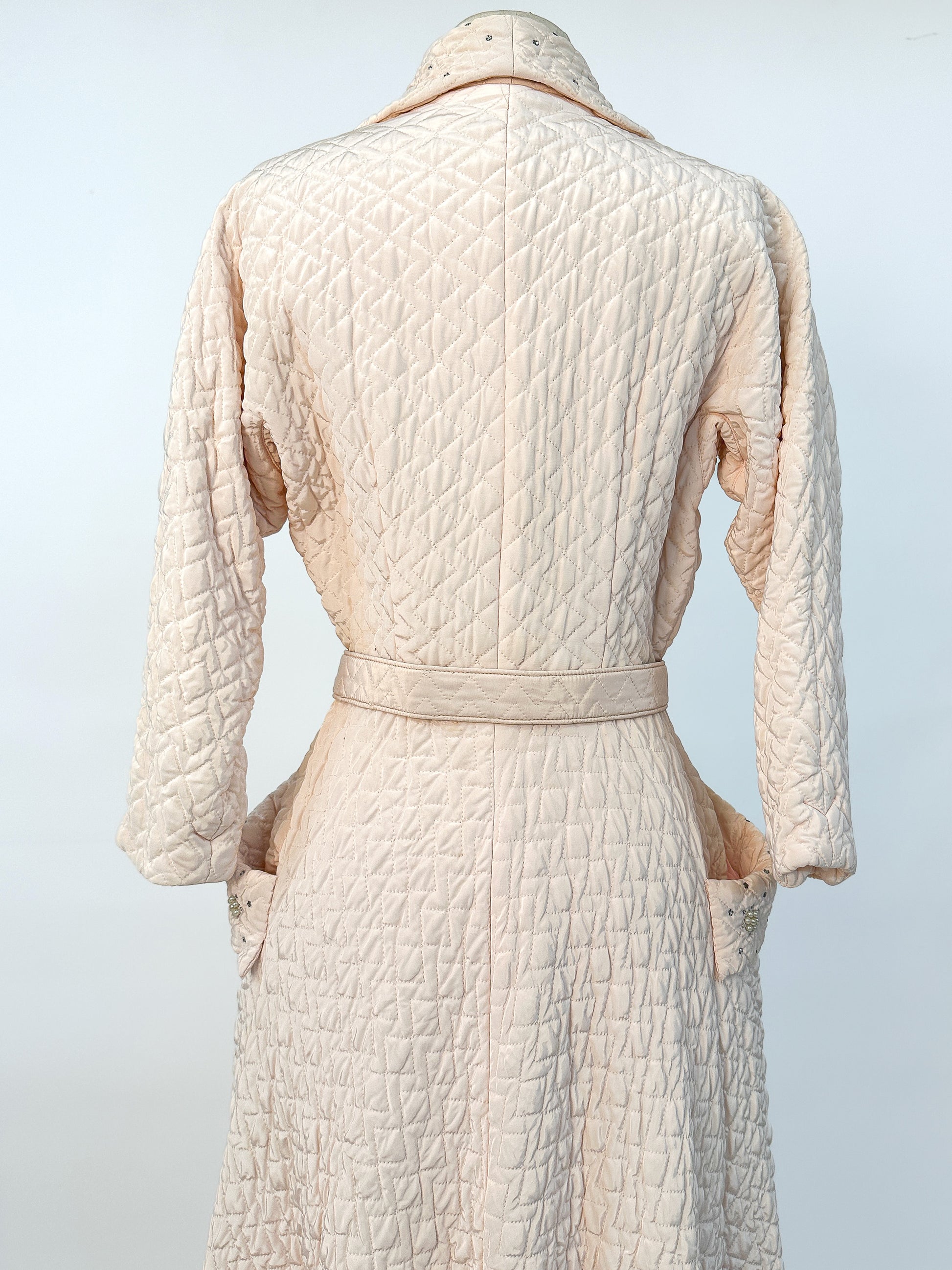 Quintessential 1950s Quilted Pink Robe with Rhinestone and Pearl Accents / Waist 26