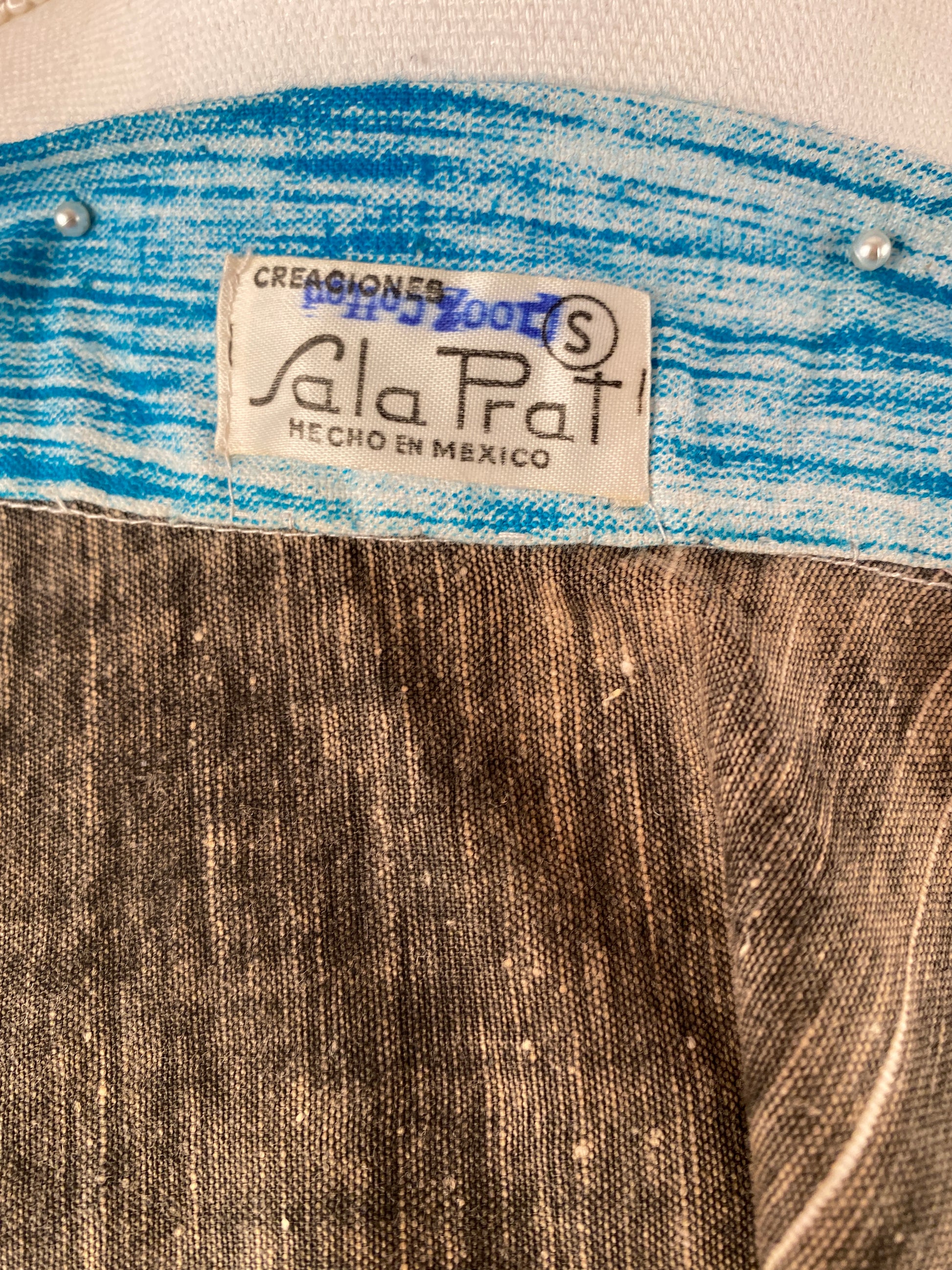Beautiful hand painted matador skirt made in Mexico. Features scenes of bull fighting in the center with borders that have items such as, swords, capes, hats and scrolls. The skirt has two sets of ties, one on the front and back. There are slits on each side that separate the waistline into two 'flaps' so the waistline can be adjusted a bit. First you tie the back flap's sash around your waist, which will be hidden by the front. Then bring the front flap up and warp-around the sash to the back.