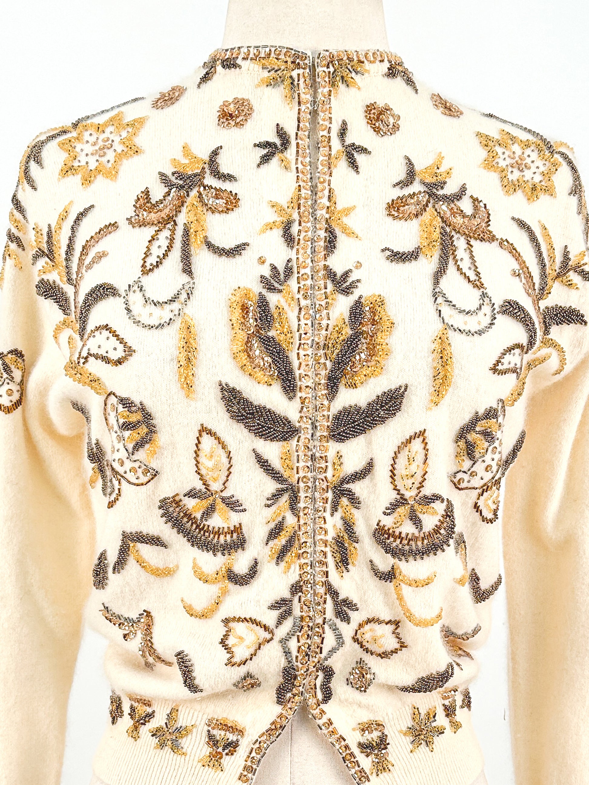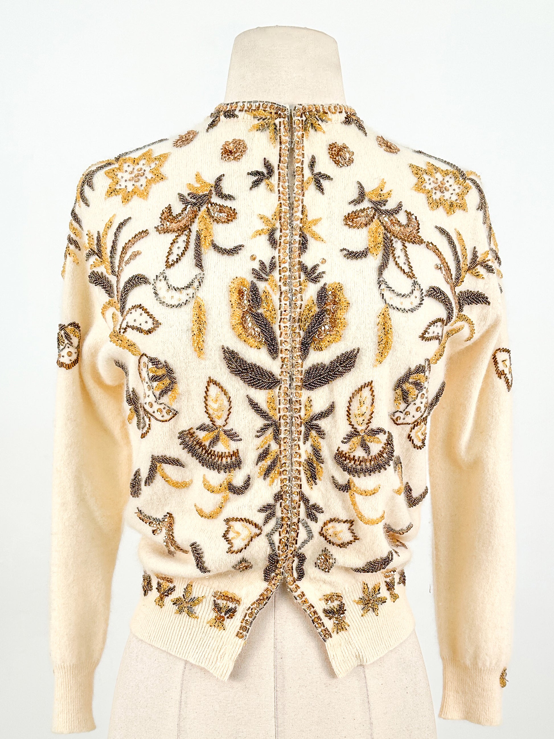 1950s Cream Autumnal Beaded Angora Sweater / Medium
