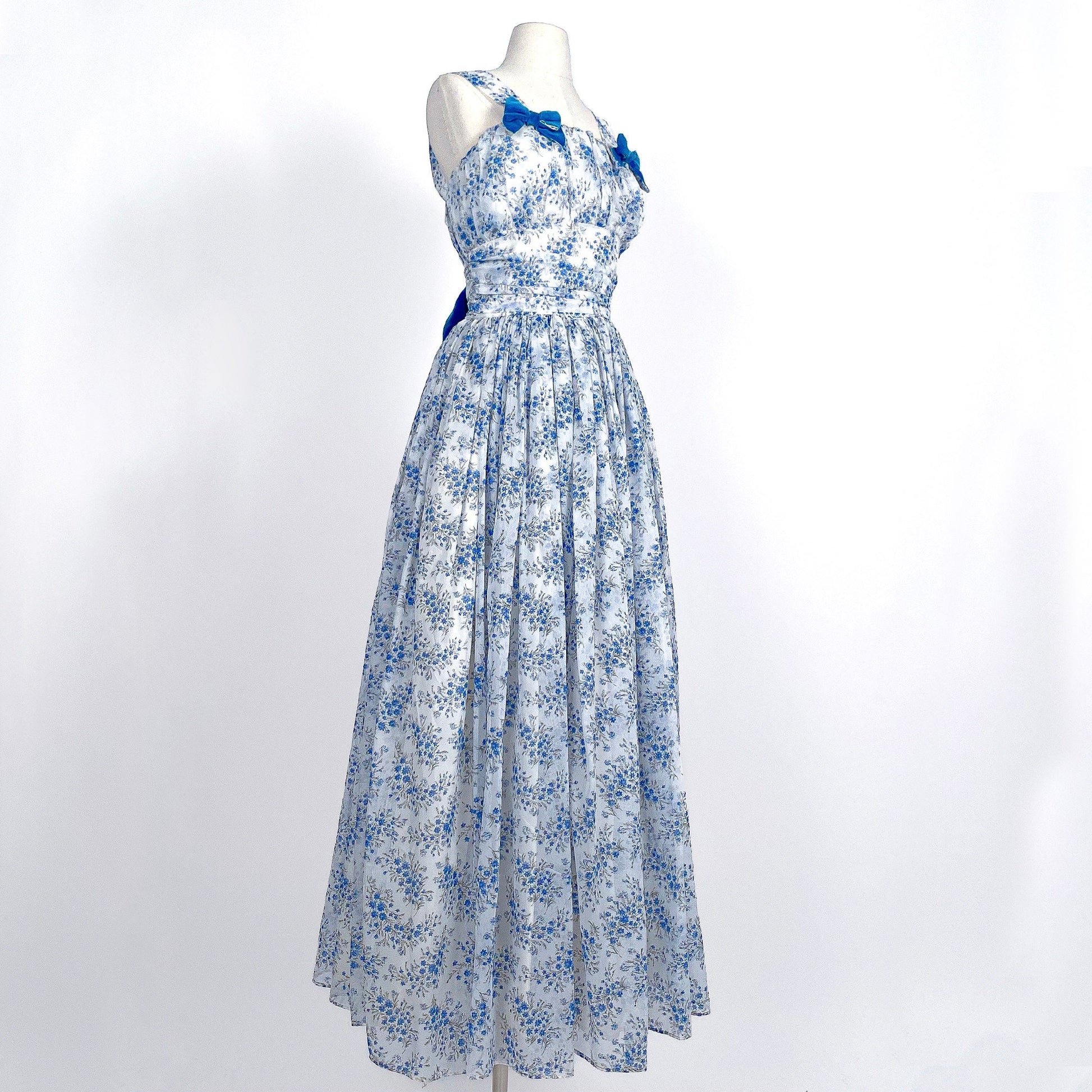 Early 1960s white chiffon dress with light blue floral print and blue velvet bows. Chiffon straps with square neckline, ruched bodice and waistline with full pleated skirt. The dress is fully lined with a thick polyester fabric to give the dress some added fullness and weight. The dress is adorned with two velvet bows on the straps and a large matching bow on the back. The bows are lined in the same chiffon fabric as the dress. Back zipper closer with a snap to secure the bow over the zipper for a seamless look.