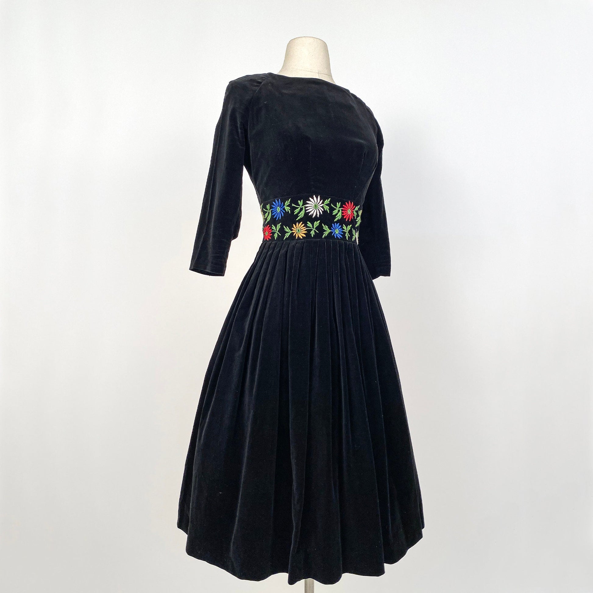 1950s black velvet fit and flare with floral embroidered waistband. The skirt is heavily pleated for a full skirt. Boat neckline with 3/4 sleeves and back zipper closure.