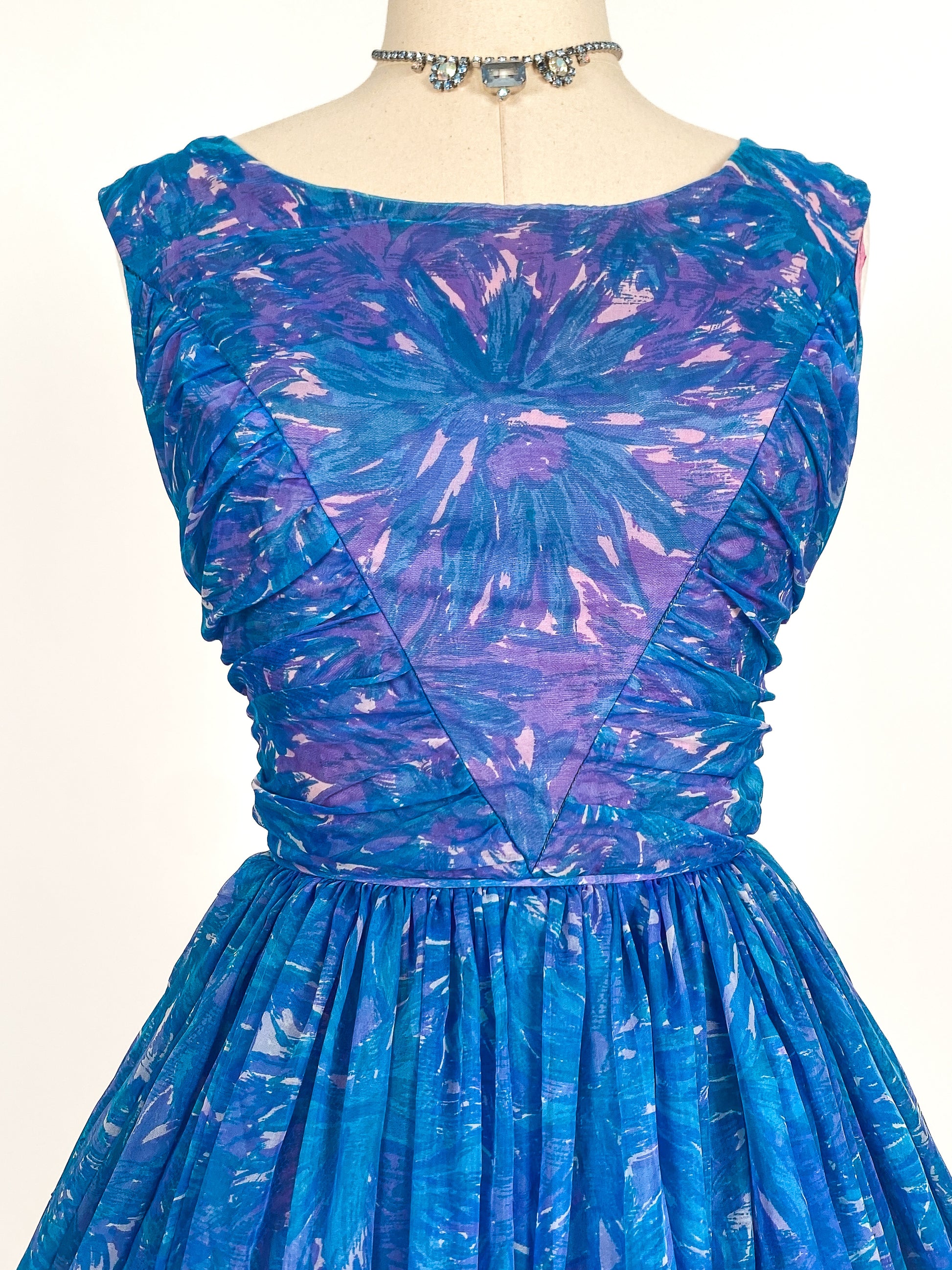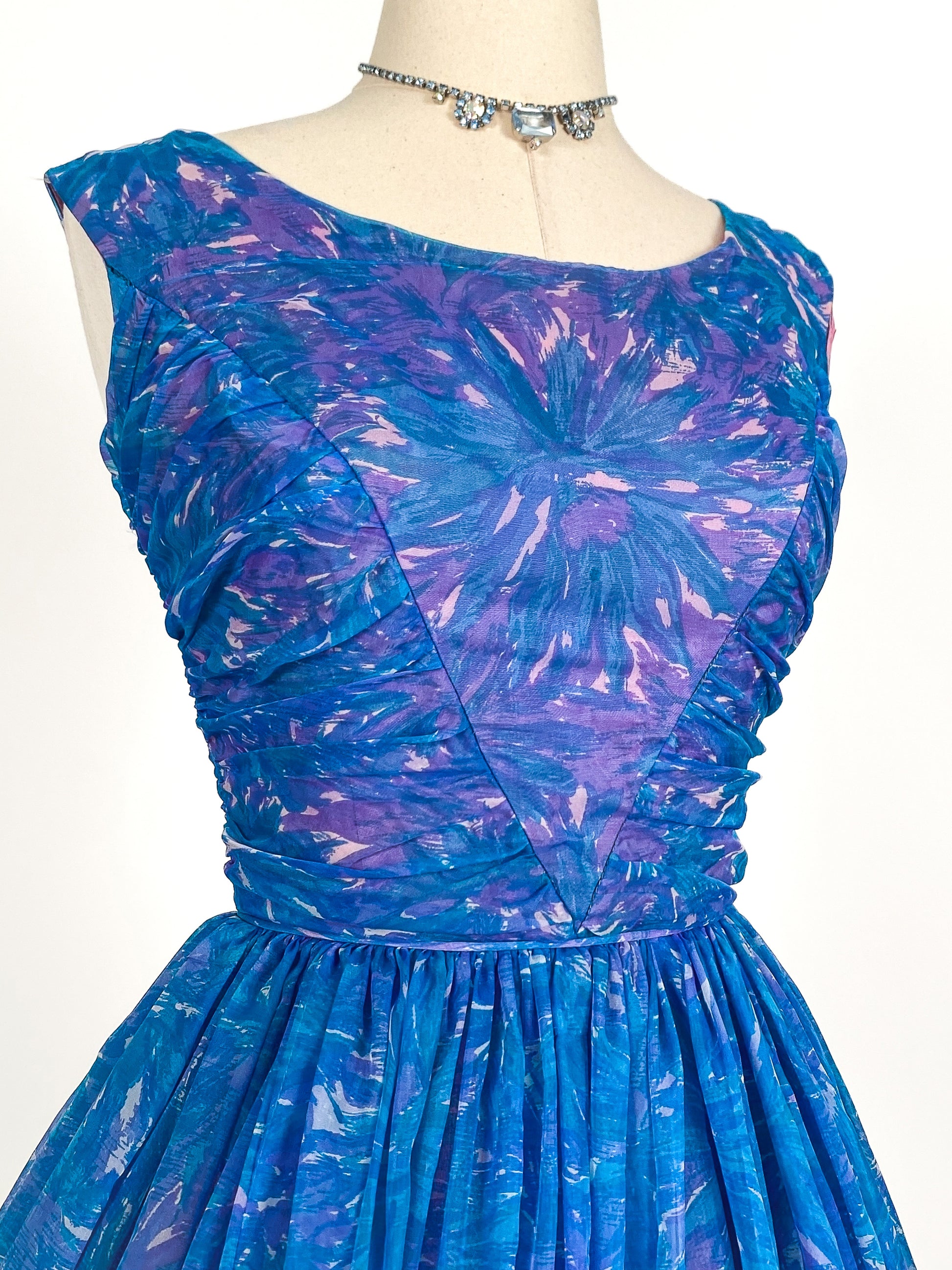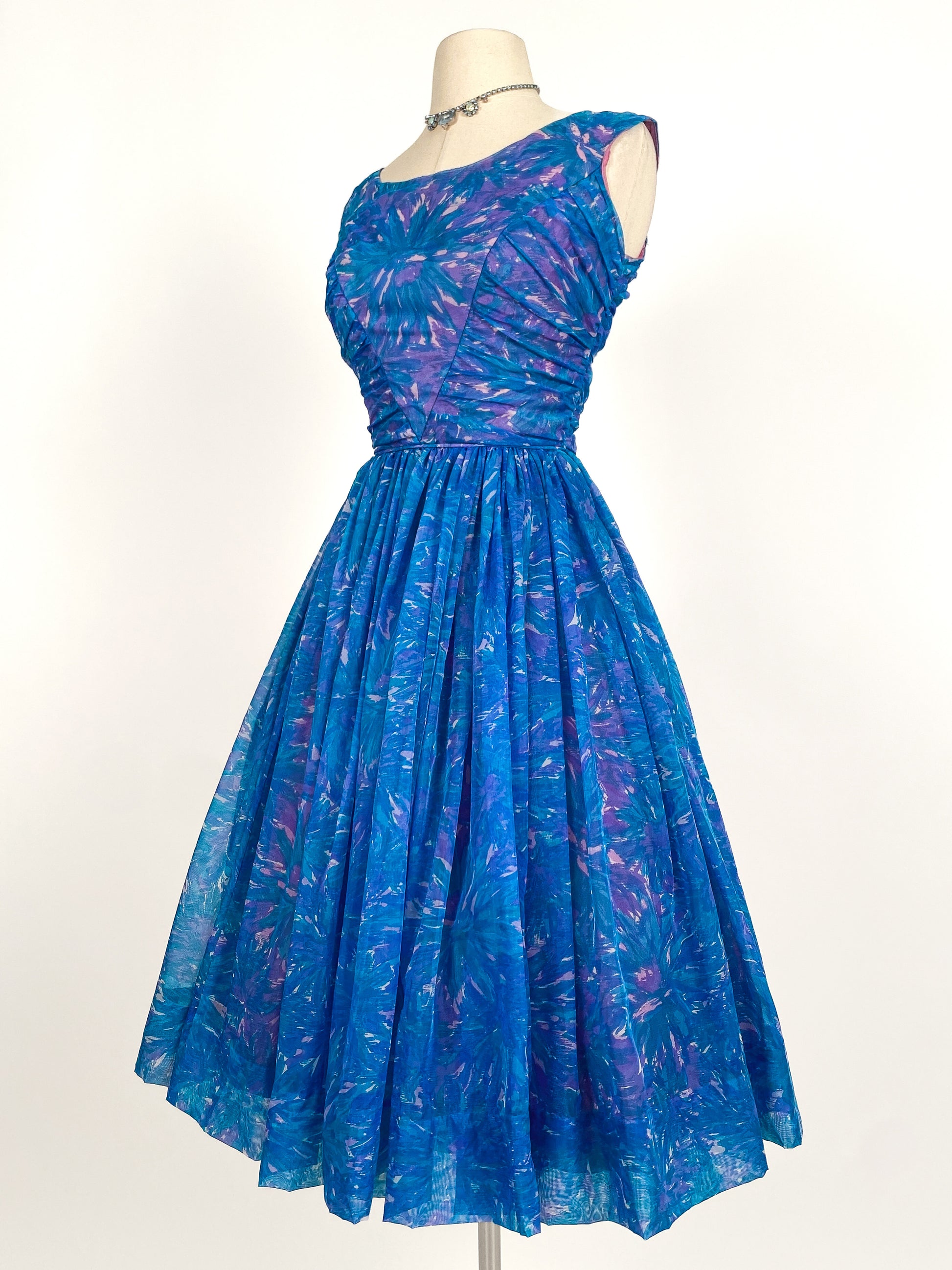 A classic 1950s chiffon fit and flare with a blue and magenta abstract floral print. Scoop neckline with ruched bodice, corded waistline and full circle skirt. A mid V-backline with metal zipper closure. Dress is fully lined with beautiful shades of purple under skirting: a light purple tulle built-in crinoline, a satin lining topped with another layer of tulle.