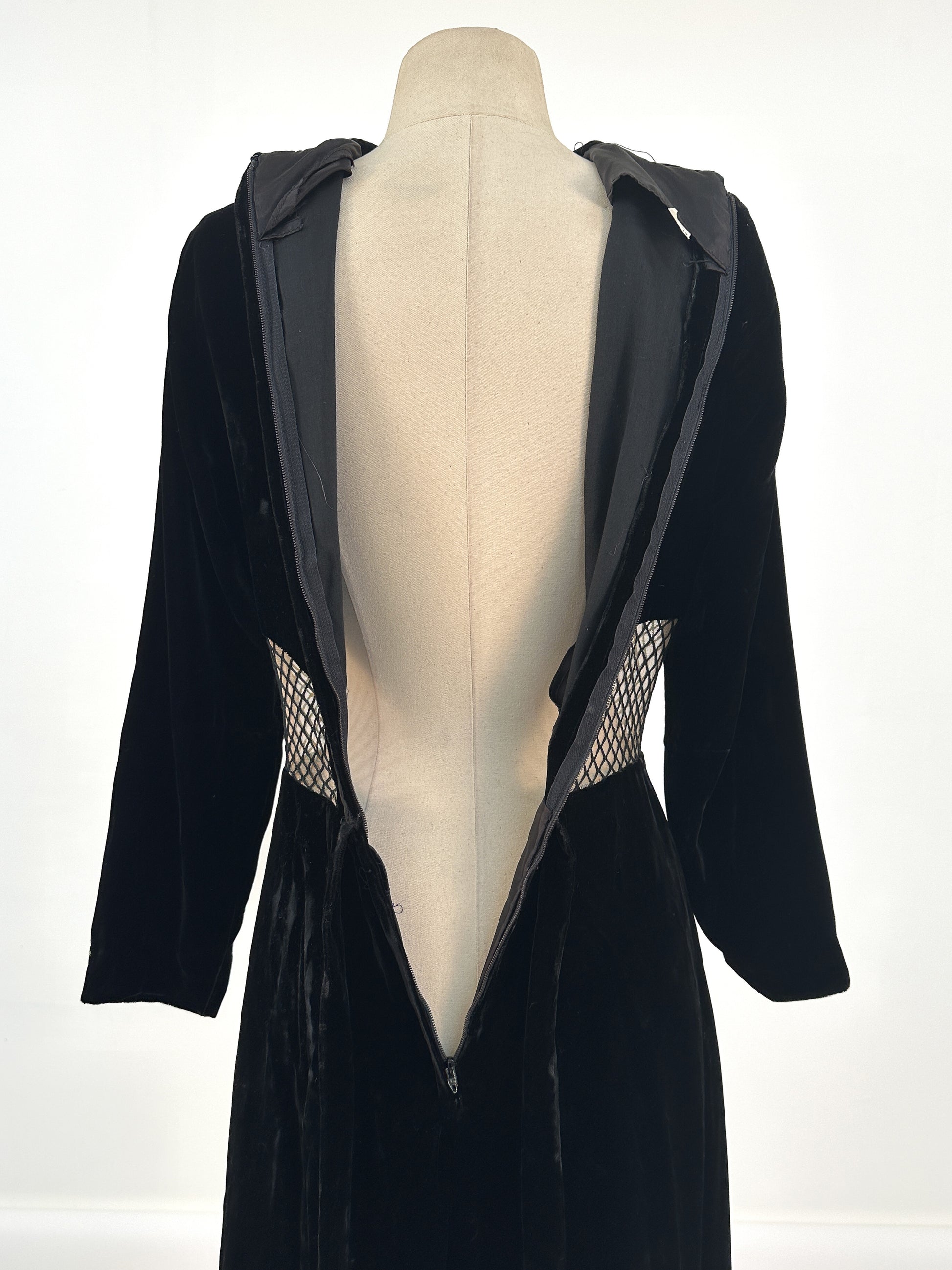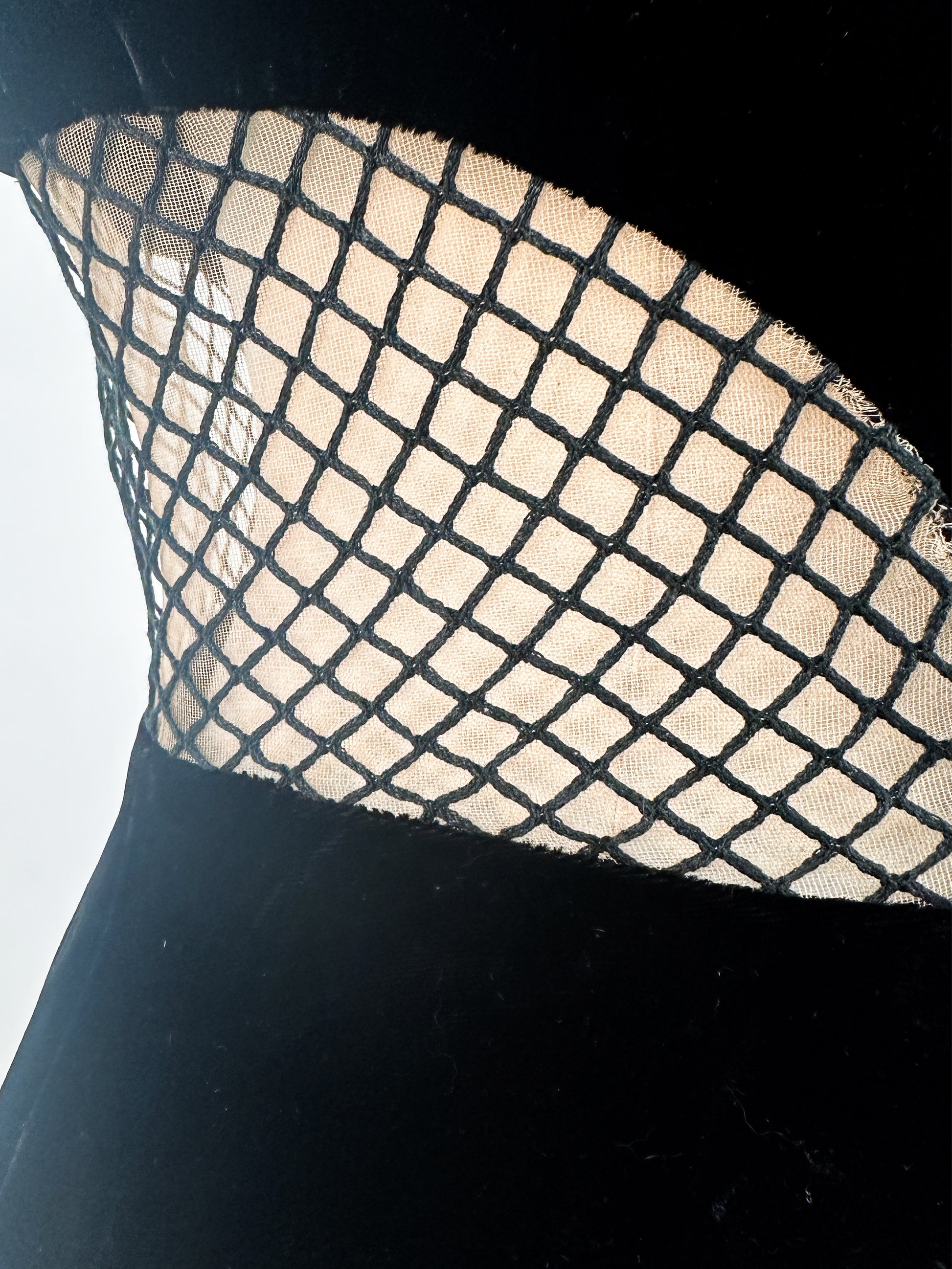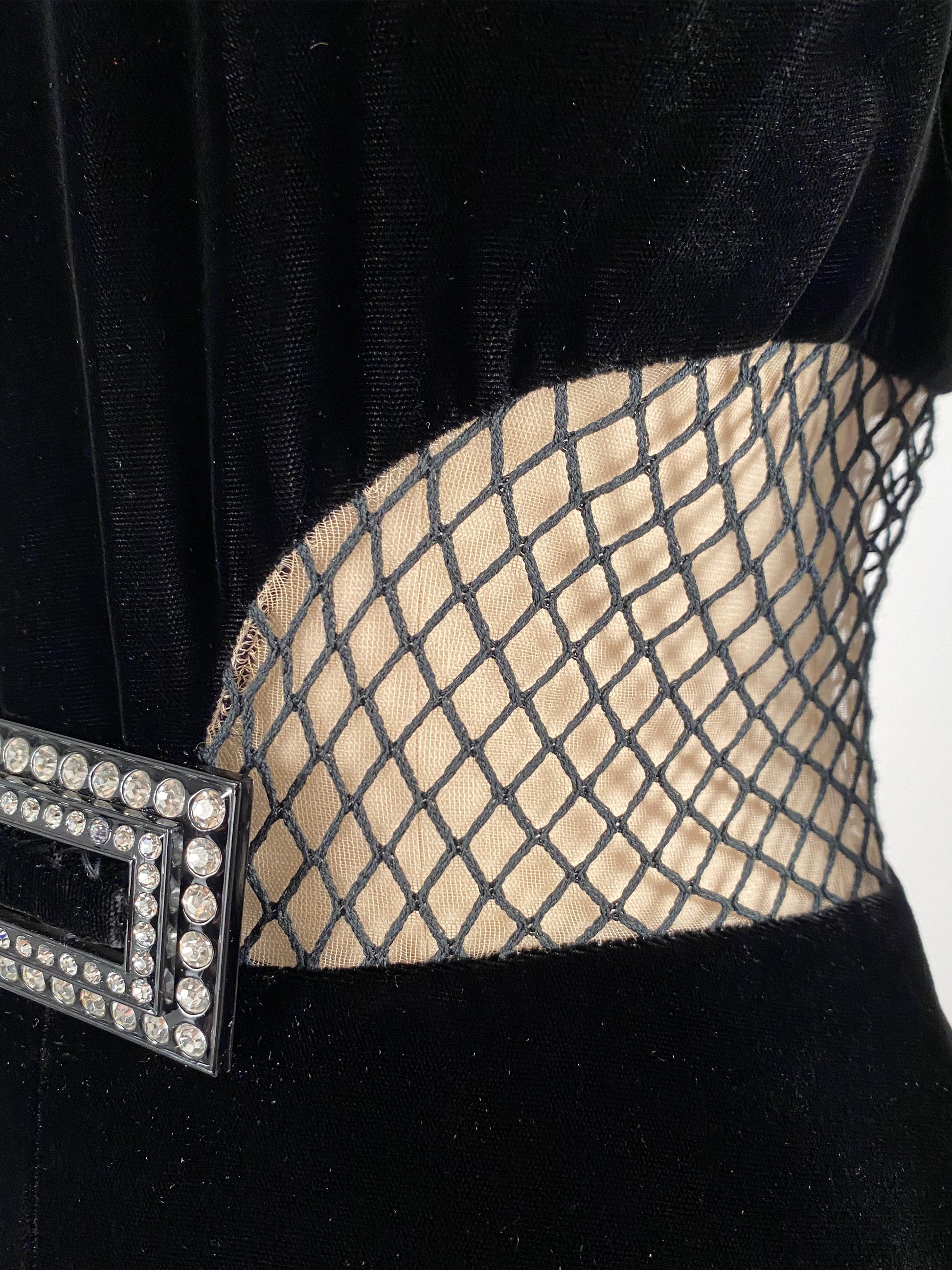 1960s black velvet jumpsuit with mock neckline and long sleeves. The jumpsuit is a stunner with the cutouts accenting the waistline; a nude panel conceals the cutout, overlaid with a black netting.