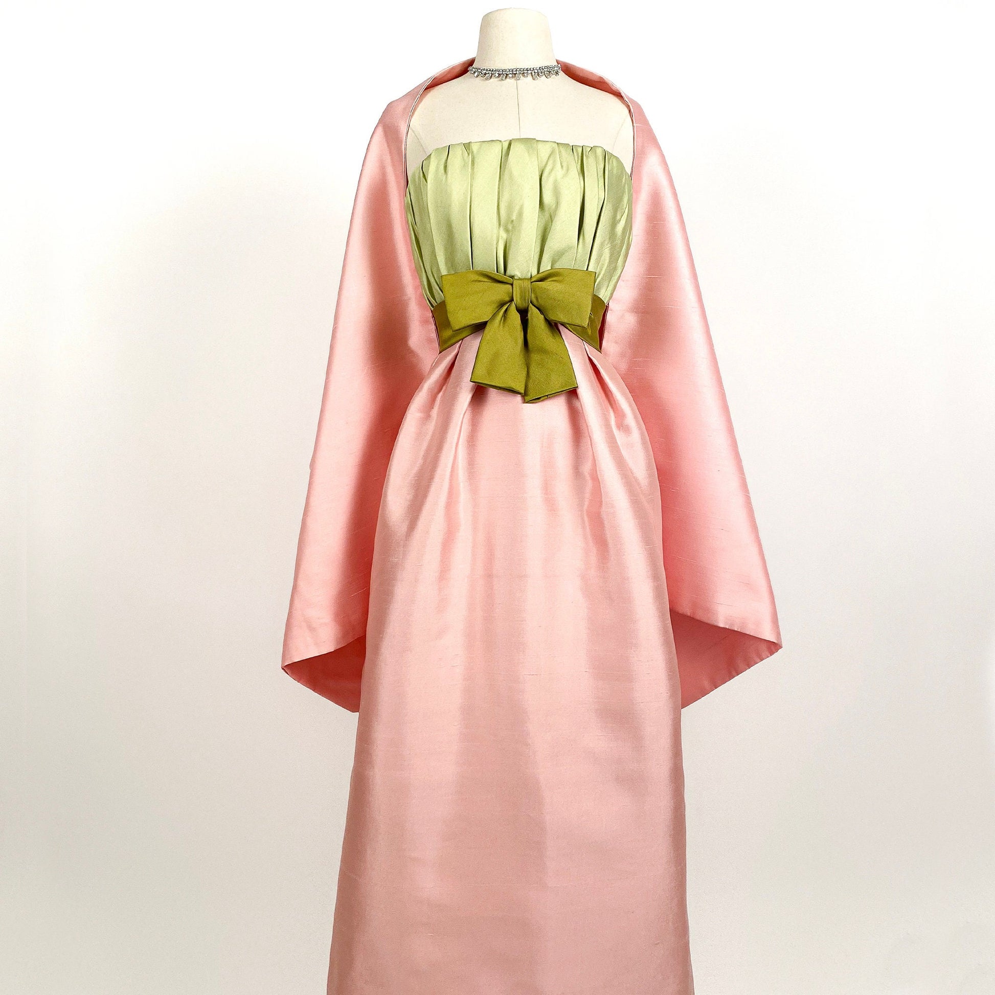 Stunning 1960s Pink & Green Strapless Dress with Wrap by Bob Bugnand for Sam Friedlander / Waist24