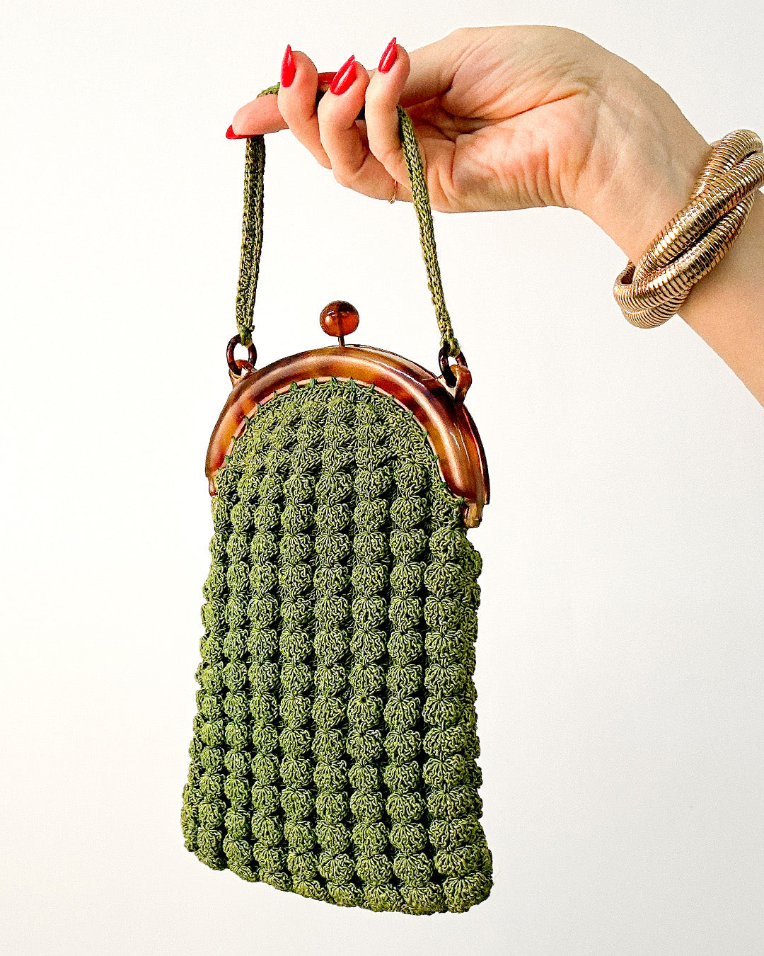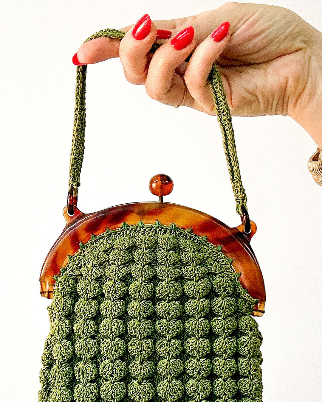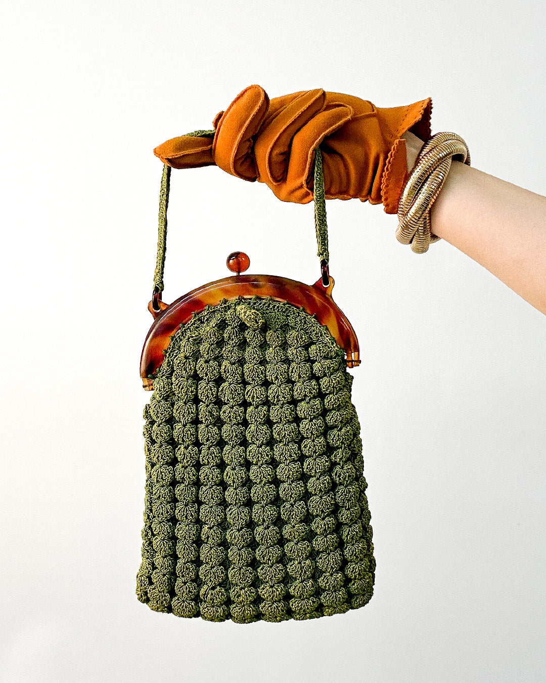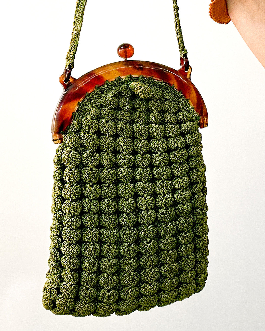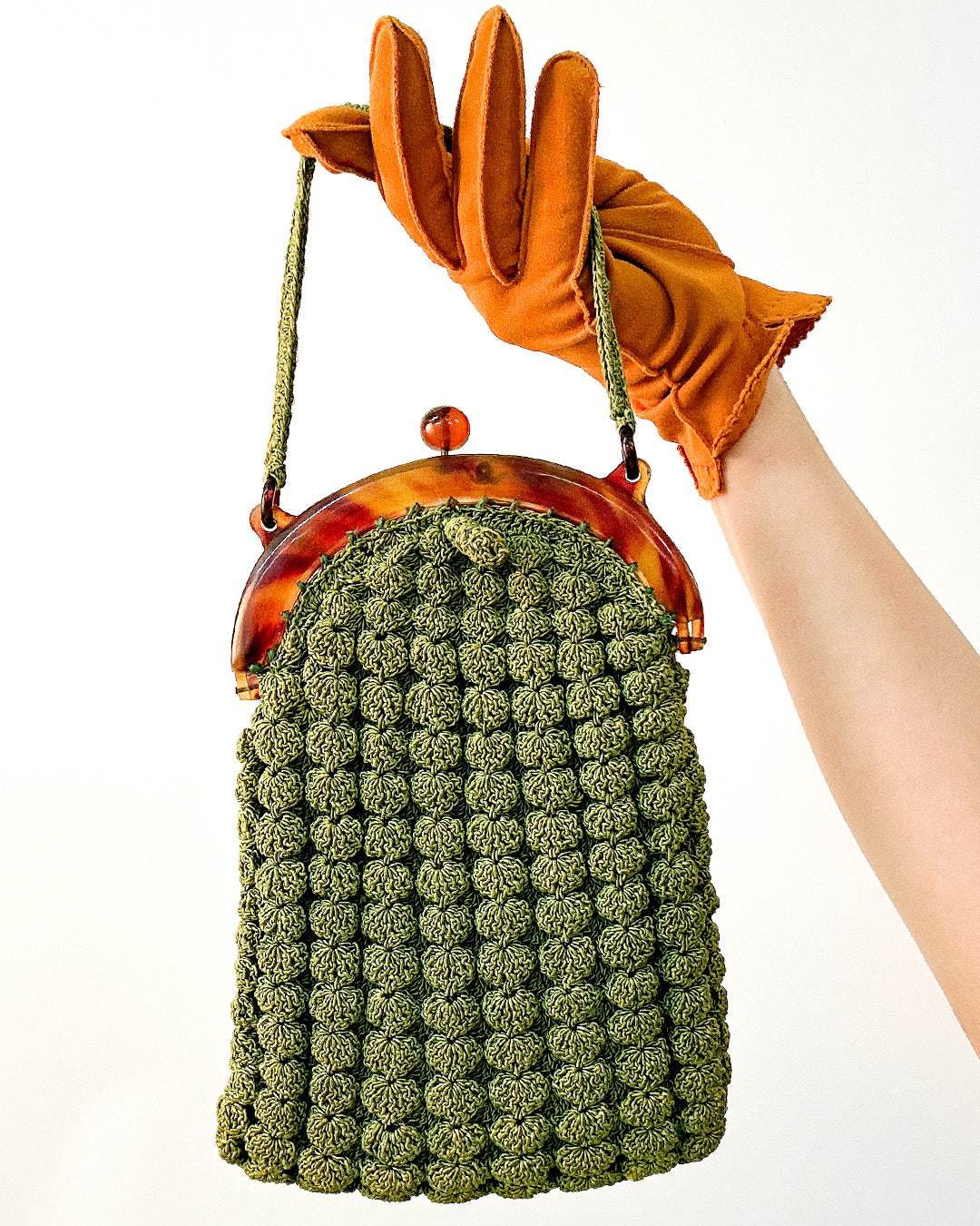 A refined treasure from the 1930s, this gimp handbag embodies Art Deco elegance with its textured design and luminous bakelite clasp. Compact yet striking, it opens to reveal a matching coin purse — a rare detail that completes the set. Both practical and decorative, this piece carries the glamour of early 20th-century style and makes a stunning addition to any vintage handbag collection.