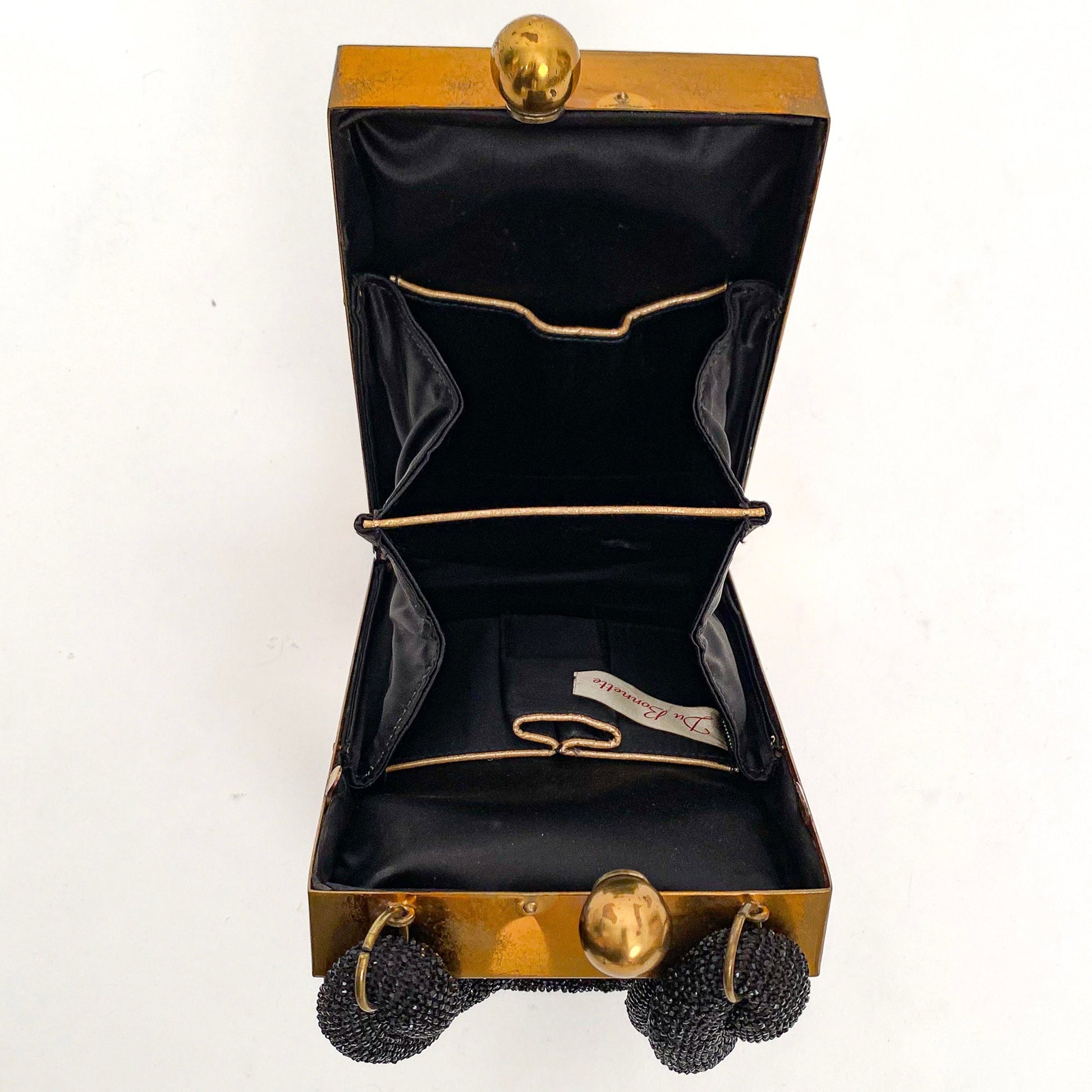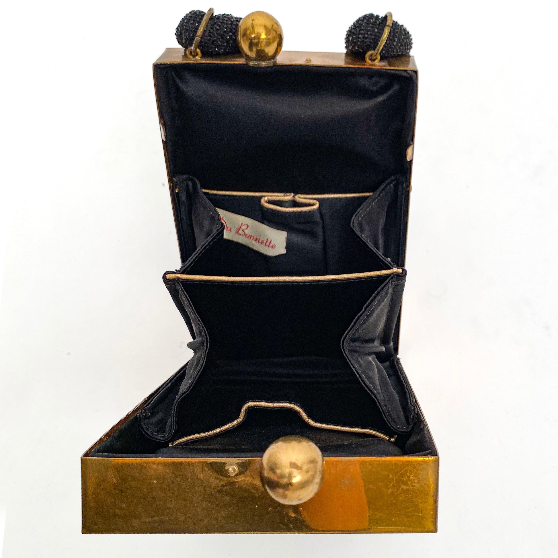 Stunning 1940-50s black seed beaded box handbag by Du Bonnette with bronze metal sides and clasp with beaded roped handle. The evening bag expands open with inner pockets trimmed with gold fabric.