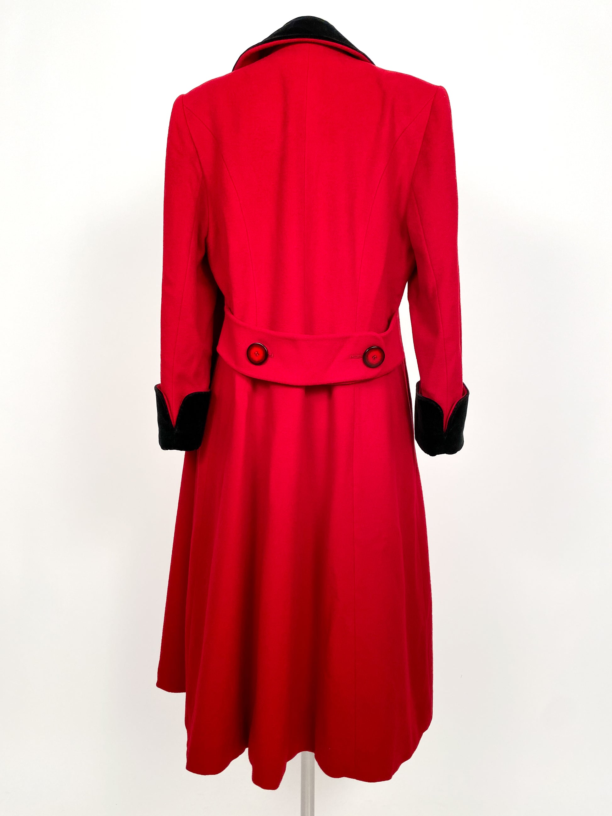 This bright red double breasted coat is a lovely piece to wear in winter. The black velvet details are a lovely accent on the collar and cuffs. The aesthetic of the coat has a slightly militaristic inspiration. The coat has a semi-fit-and-flare shape with a band detail on the back. Two pockets on the sides of the coat, a great red lining.
