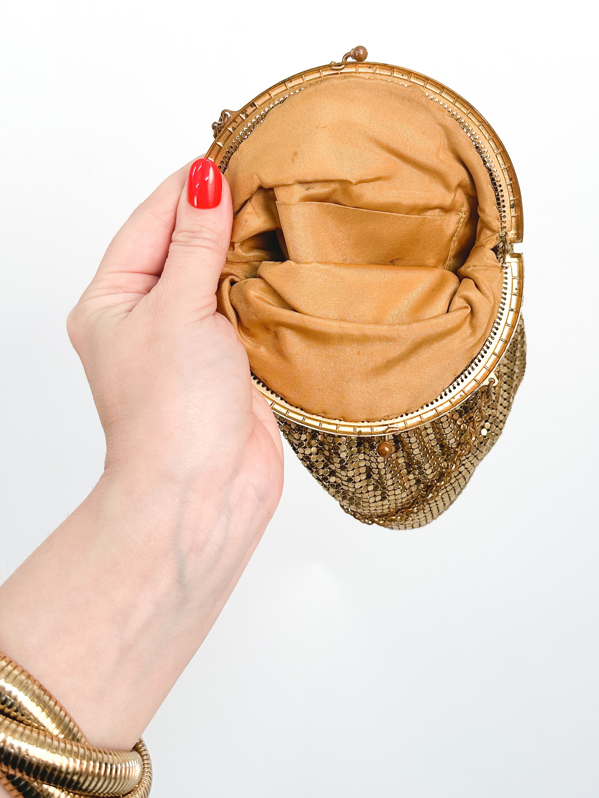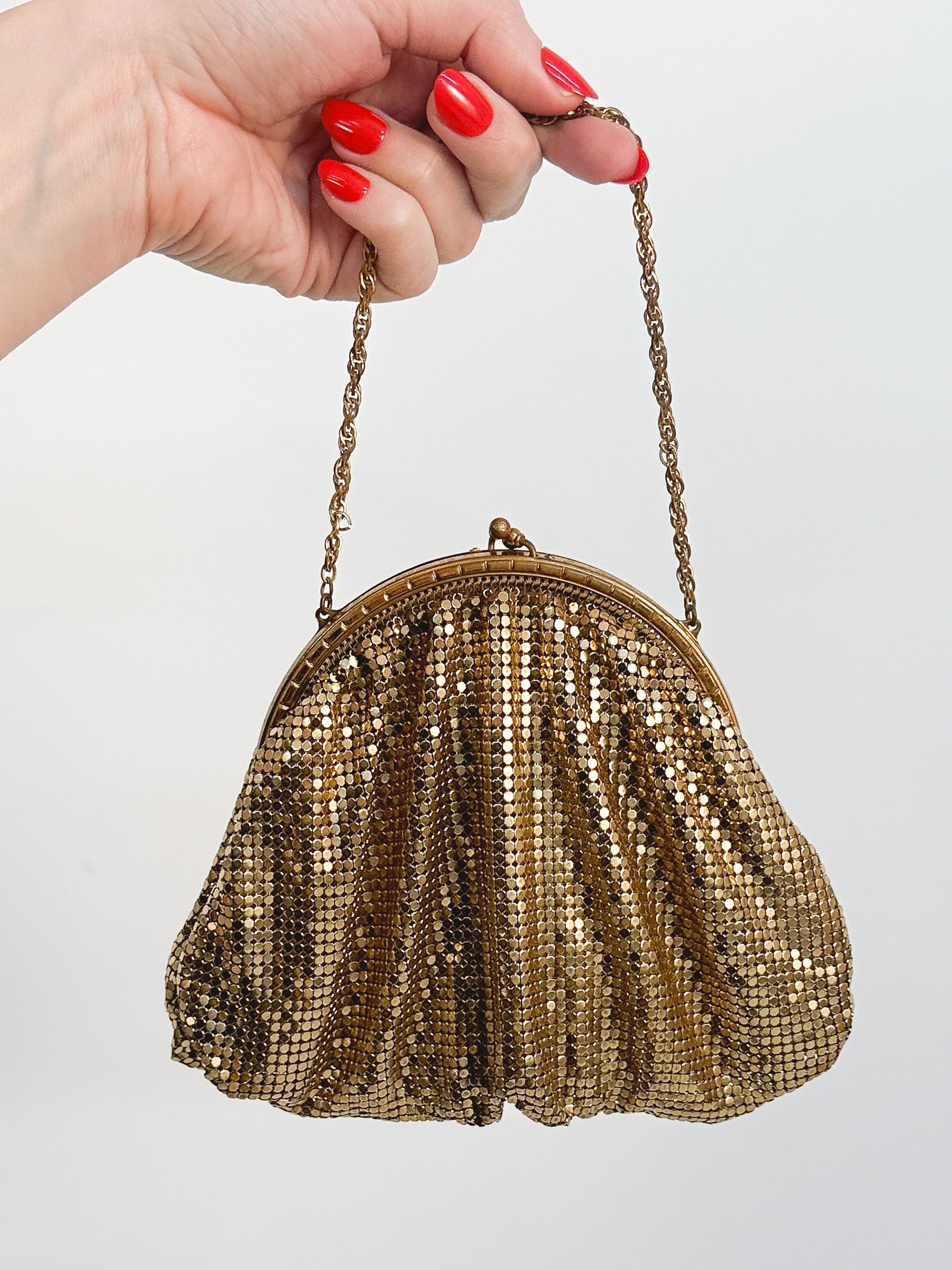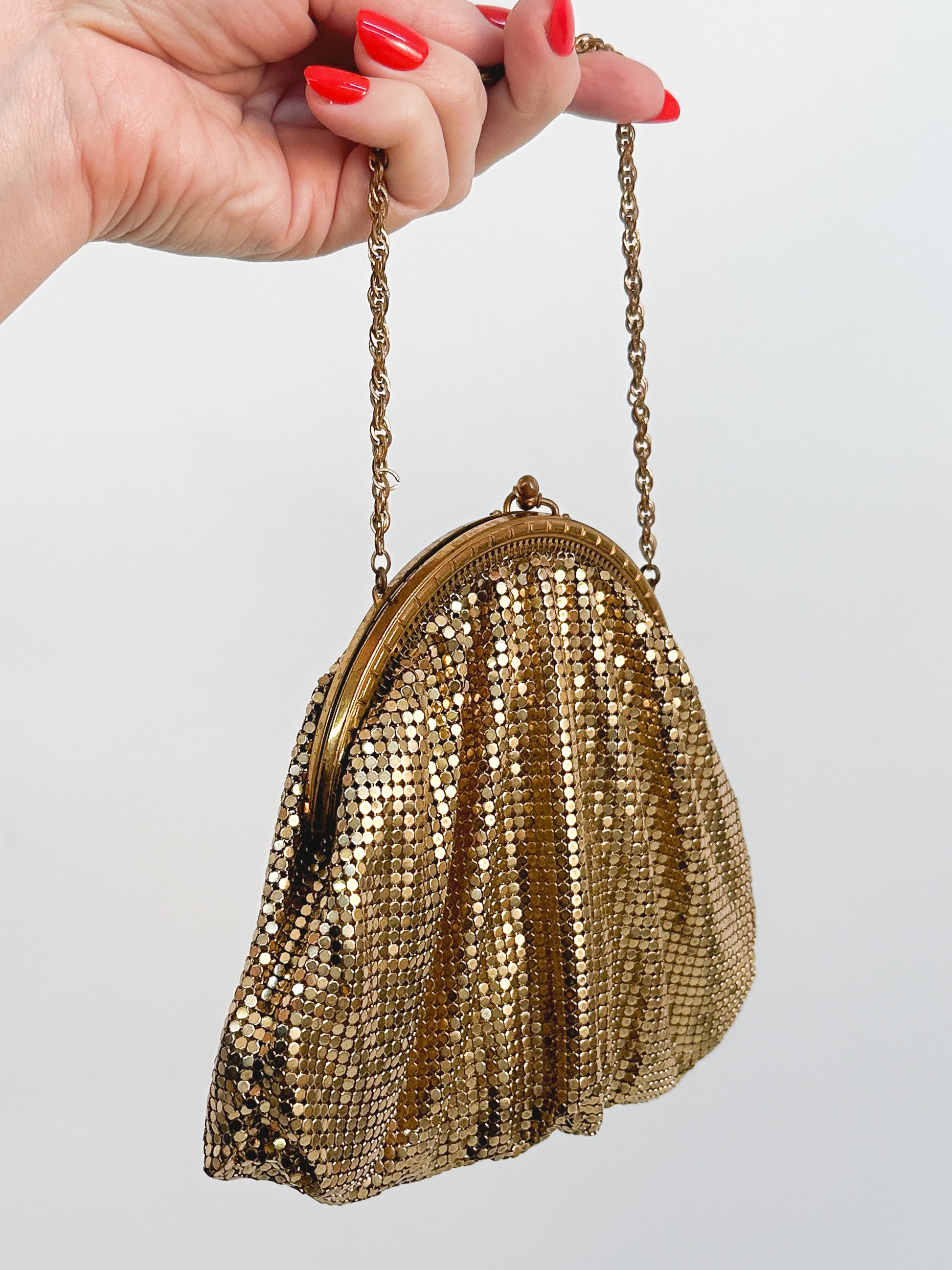 A timeless symbol of vintage elegance, The Fifth Avenue Purse by Whiting & Davis captures the golden glow of mid-century sophistication. Crafted in the brand’s signature fluid gold mesh, this purse shimmers with every movement. Sleek, structured, and impossibly chic. Its delicate chain strap and refined clasp make it the perfect finishing touch for any evening ensemble.