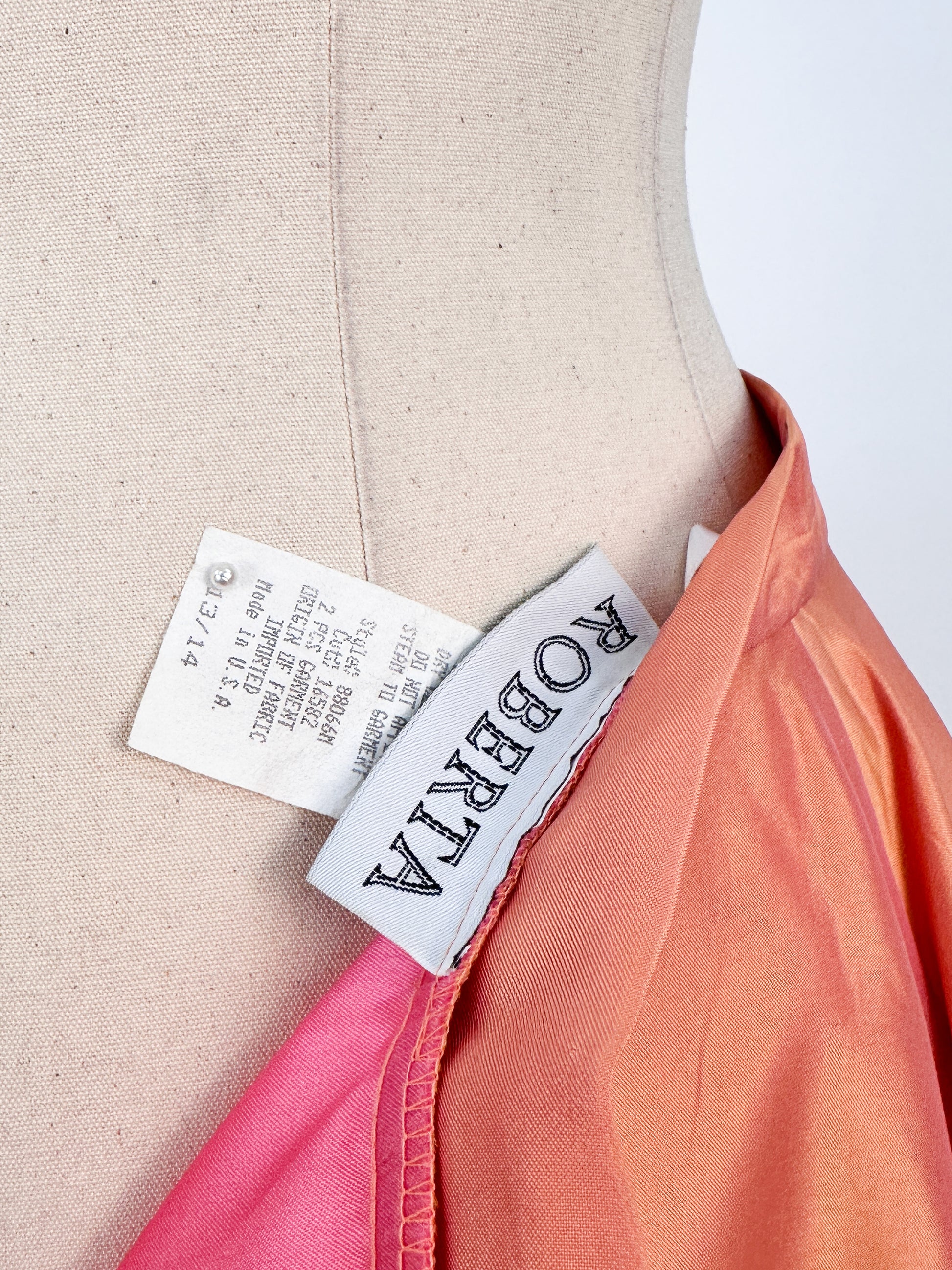 Strapless two-piece formal in a soft ginger or copper color acetate comes with a fun pink underside. Top has light weight boning in front, sides and back providing added support. Skirt flares from waist giving added fullness. Good vintage condition. Zipper on both top and skirt back.